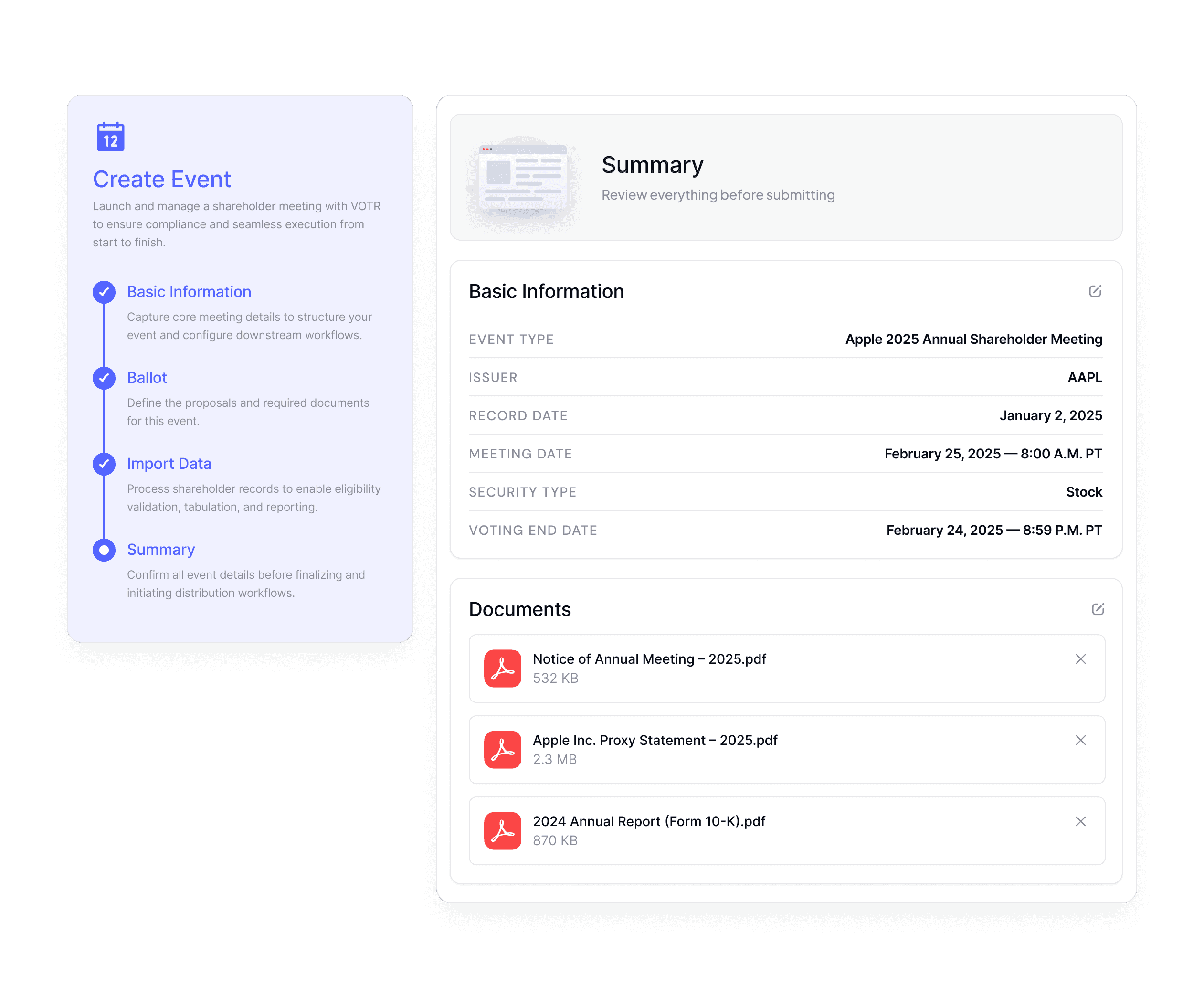 You can create and run your Issuer's first proxy or shareholder events in minutes.